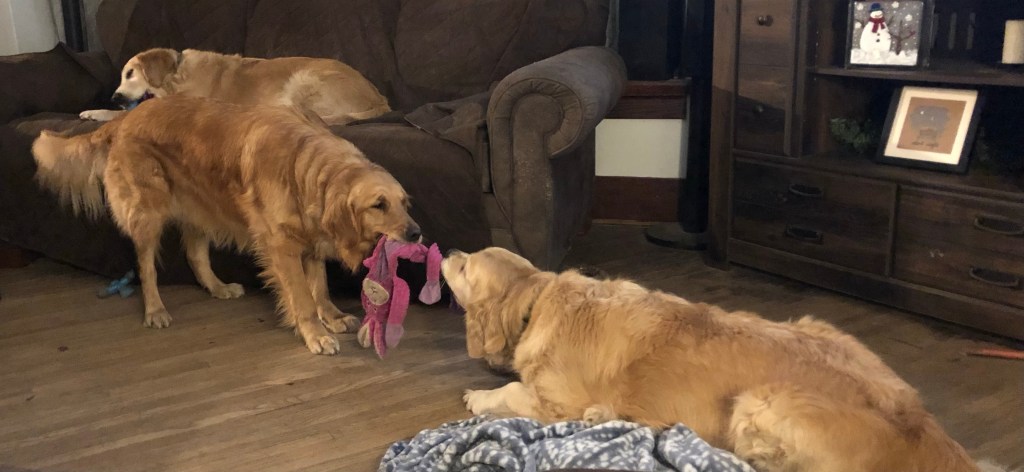 Bea: I like the “stand and tug” method of tug of war. Bessie: I like the “lay down and pull steady” method. Together it always makes for a challenging match. ~Bea and Bessie Pups