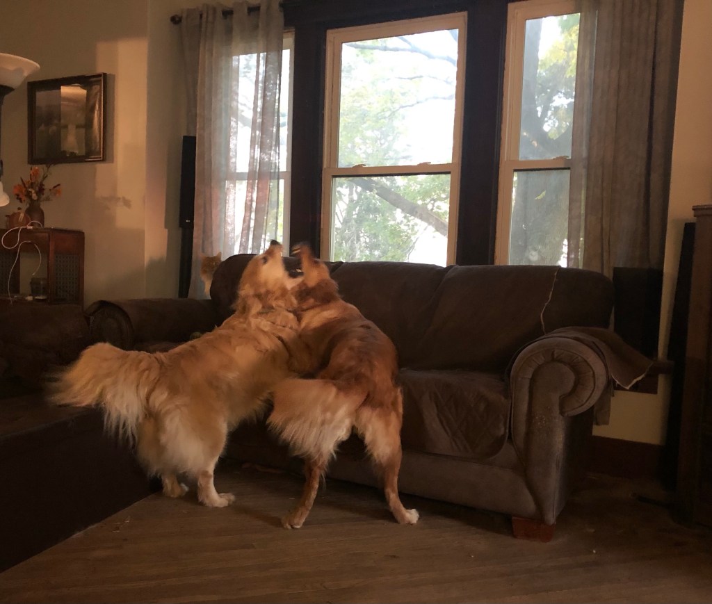 We like practicing our jaw sparring and roughhousing skills. We are really good at it! ~ Bessie and Bea Pups
