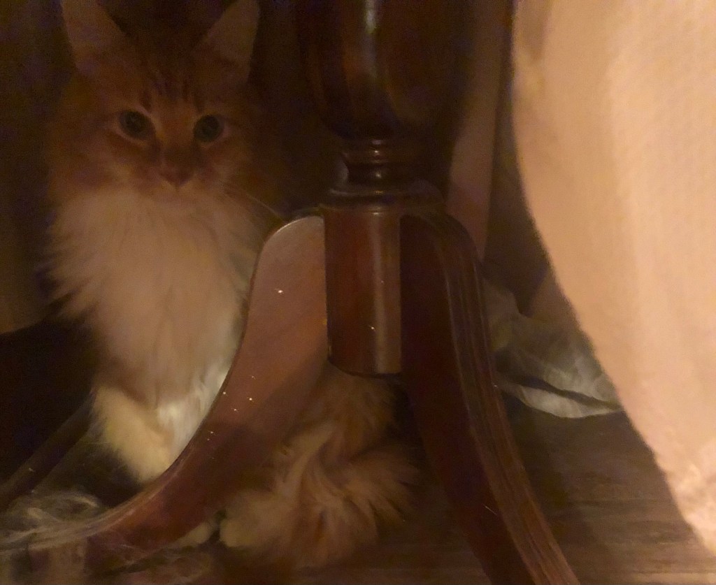 “Oh um hi there. You do not see me hiding under the tablecloth that’s on the table on the landing so I can sneak upstairs for the night. Nope nothing like that going on here.” ~ Linus Kitty