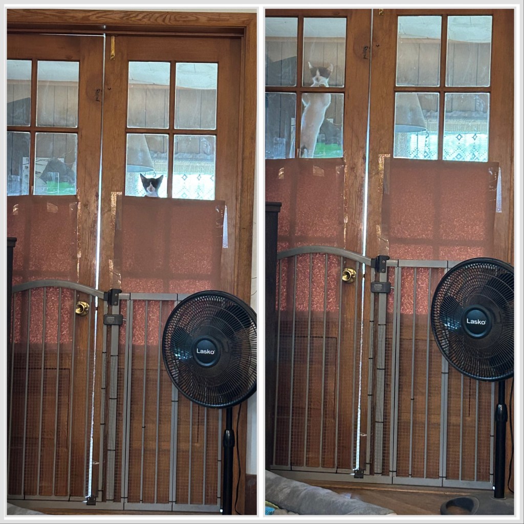 Note: during the limited time each day that the double doors are closed the boys like to climb up the window frame to see what they are missing. Gus Gus who was the most timid is now the adventure kitty loving to go higher and faster in all things except facing barky sister pups. That’s where Graham shines, he stands his ground when the pups start barking and looks at them with a relaxed “What’s up” attitude. His actions are helping them to get used to having kittens in the family. Still making progress…~ My Margret