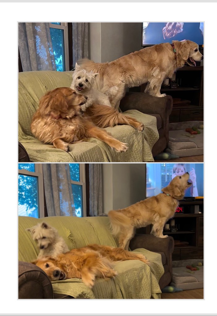 Note: so the kittens this morning climbed up the closed Kitten Palace door and stood looking in at Scruffy. Cause of course Scruffy to bark. They dropped to the floor but Graham stayed by the door while the barking continued. After a quick discussion Greg put Scruffy’s harness and leash on her with a second leash on her collar then he held her. I opened the door and Gus Gus ran into the living room and straight under the couch where he stayed. I picked Graham up and the two in a very controlled atmosphere met nose to nose. As Graham mentioned he started purring almost right away. Scruffy stopped barking and moved to whining then a few seconds of silence. After about 10 minutes Greg took Scruffy out to the pup porch with the other pups while Graham and Gus had playtime in the living room. Progress…~ My Margret