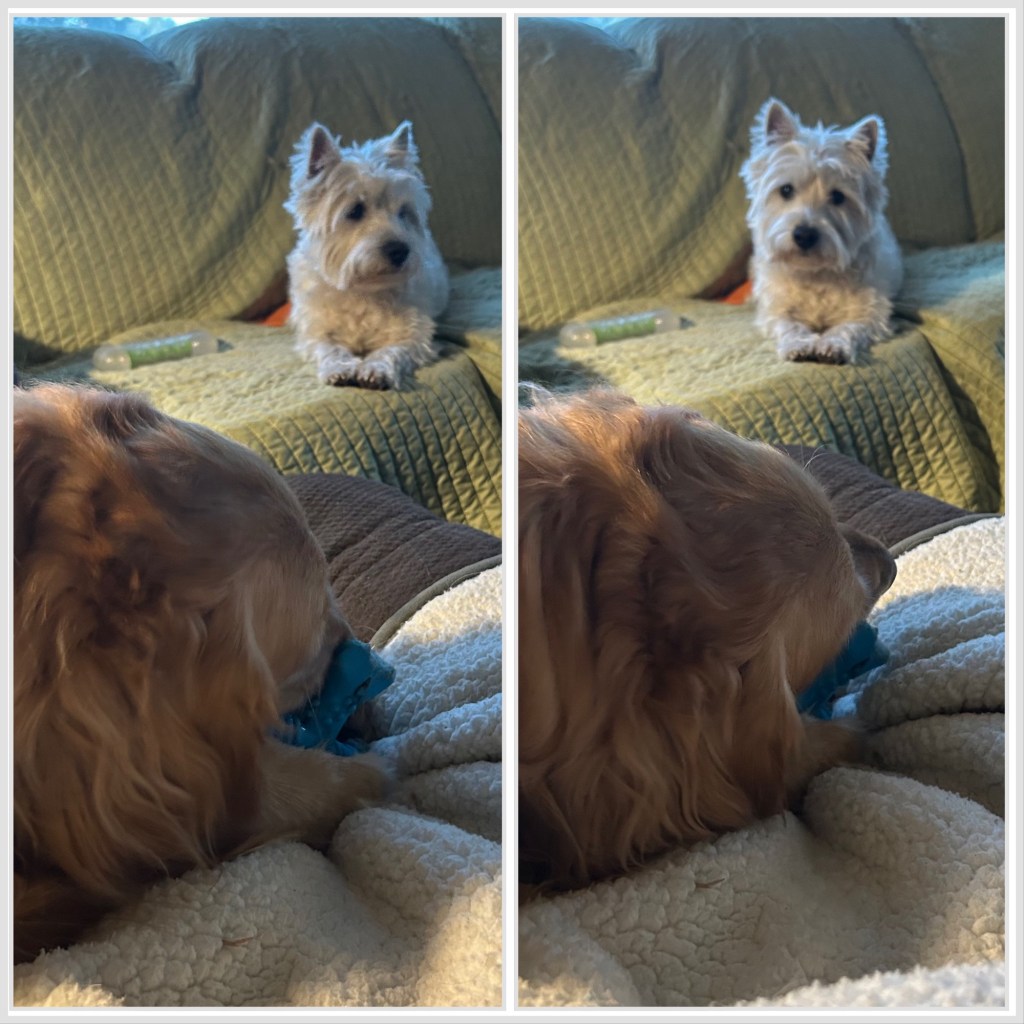 My Greg I do want to come sit with you but I need to keep watching Bea so I can grab the toy when she’s finished playing with it. ~ Scruffy Pup