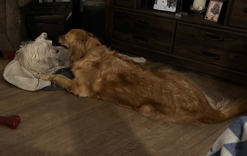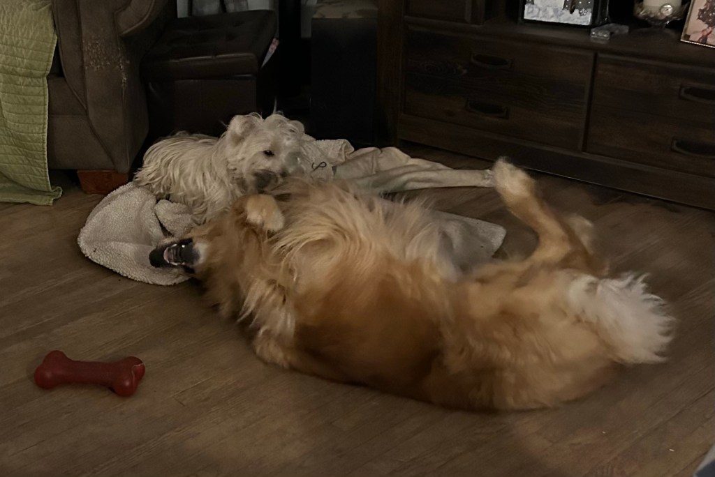 Bea and Scruffy: Our My Greg is back!!!!! He’s been gone doing errands FOREVER!!!!