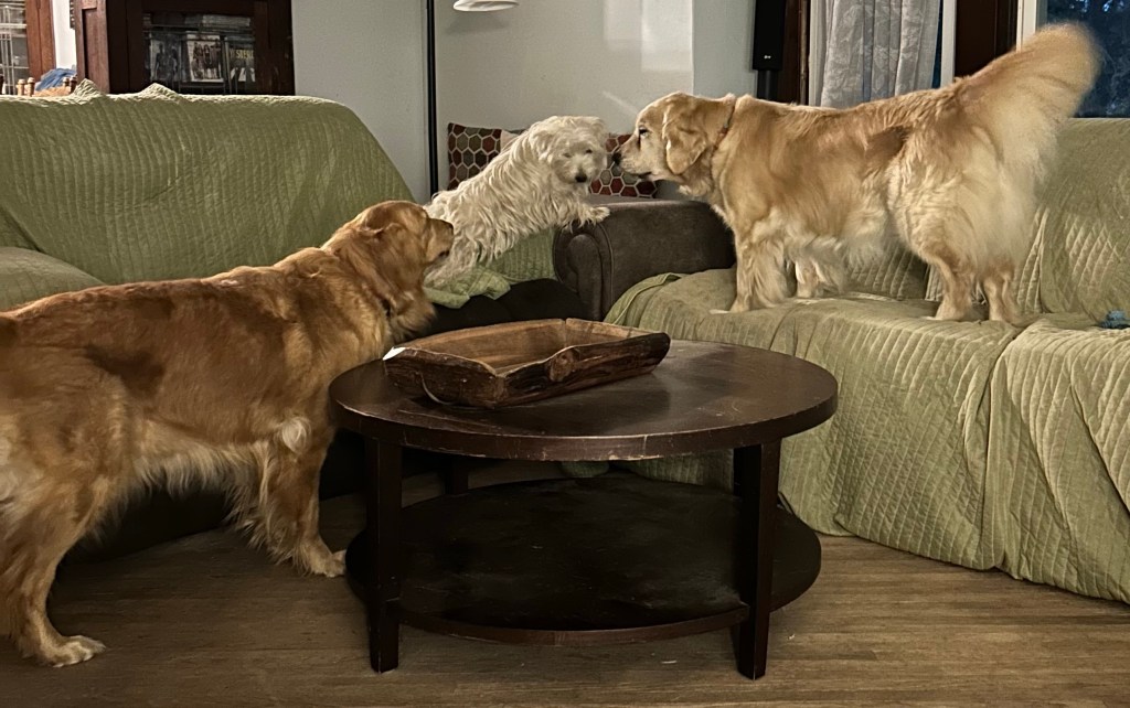 My Margret says sometimes we have to share and her lap is big enough for both of us. Sigh…. ~ Bea Pup