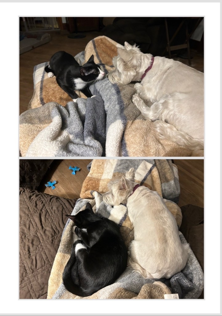 You know when you are trying to sleep and your kitty brothers just keep roughhousing around you? Yeah that. ~ Scruffy Pup