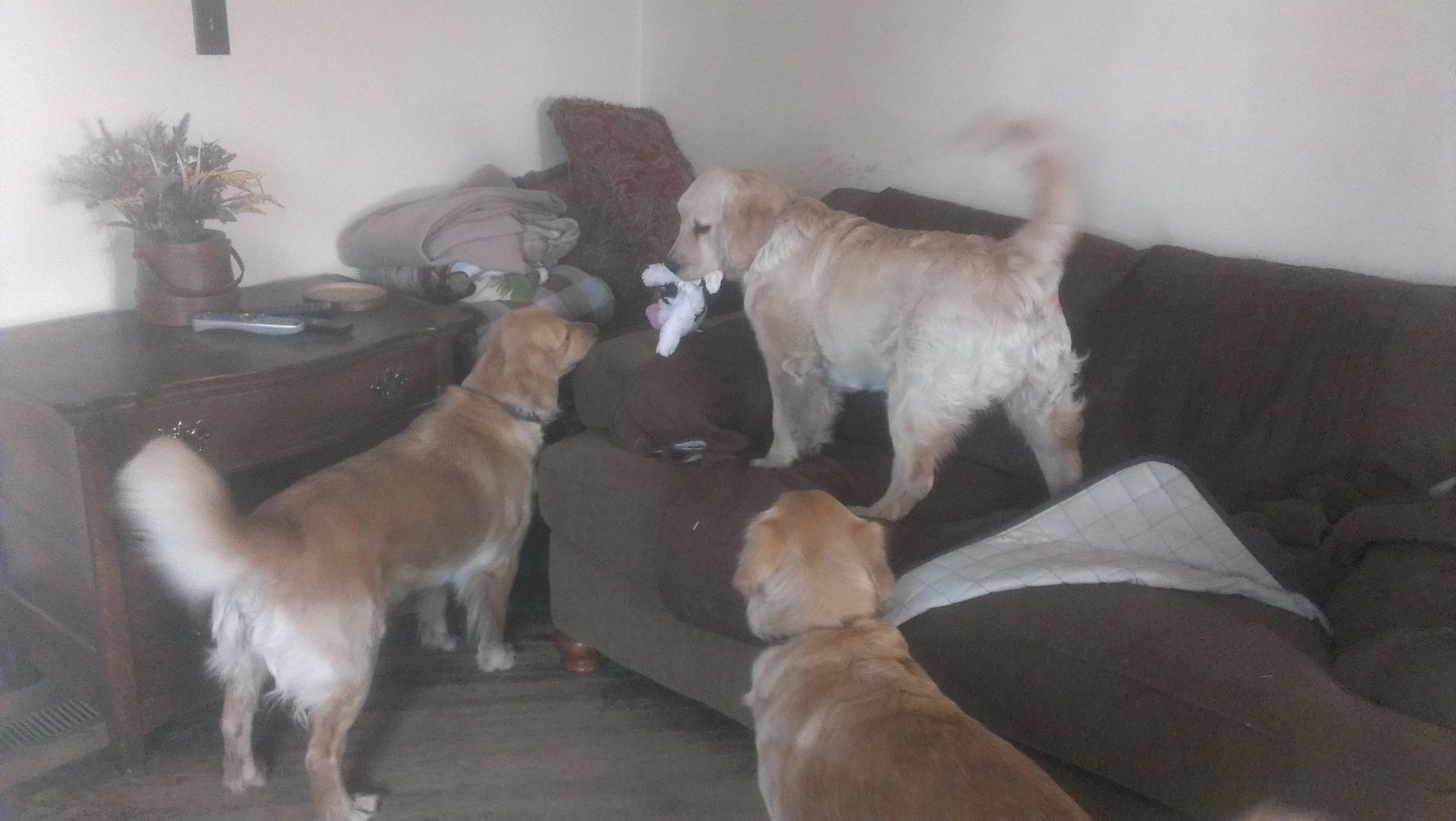 A few weeks ago we decided to try having Bess pup sleep uncrated upstairs with Bonnie, Belle and Greg and I. After a week getting used to the new arrangement it’s working out well and the crate will be taken down and stored for some future use.